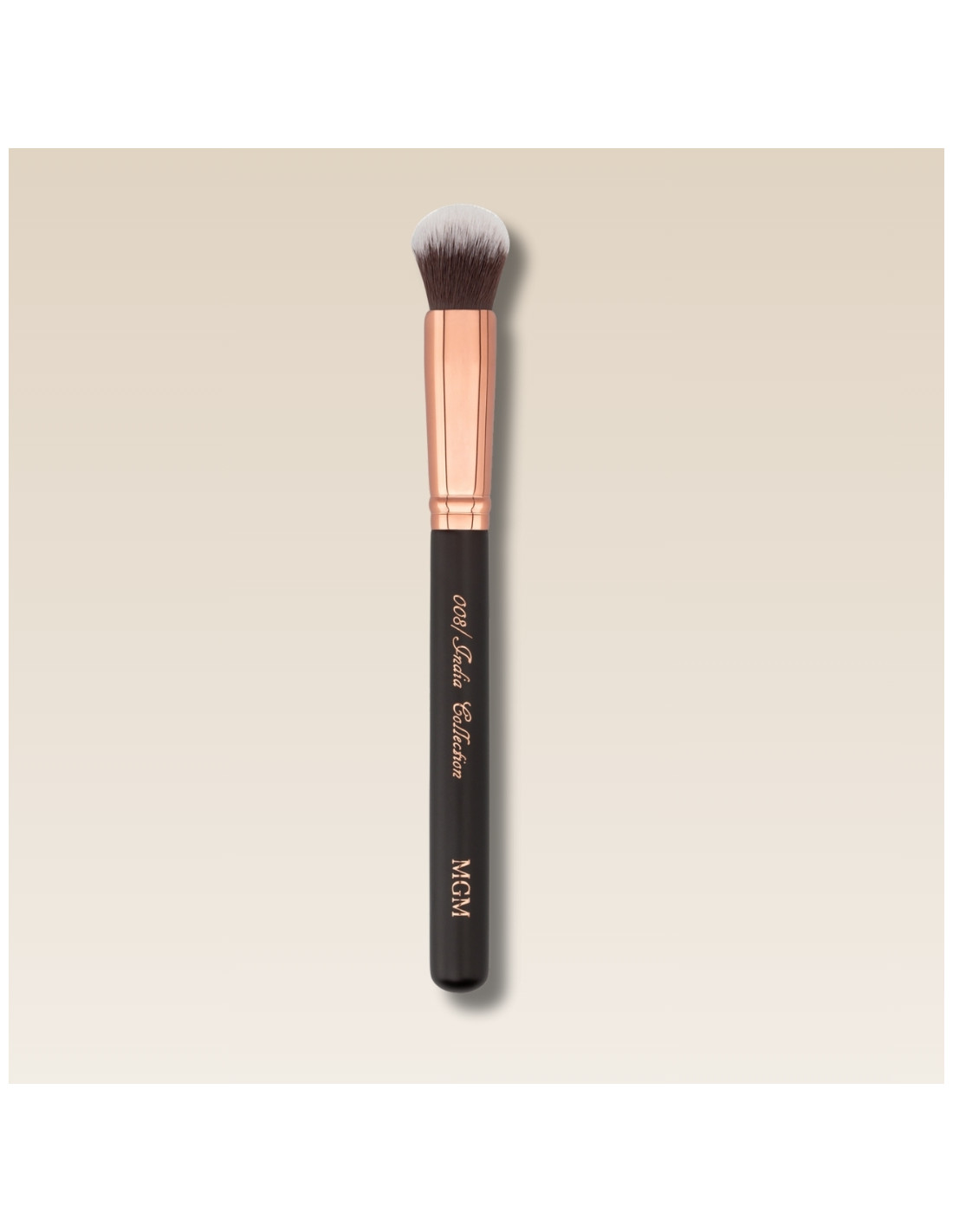 Pincel redondeado mediano de fibra sintética bicolor, perfecto para la aplicación de productos cremosos, su forma permite trabajar con suavidad zonas concretas del rostro dejando un acabado sublime.