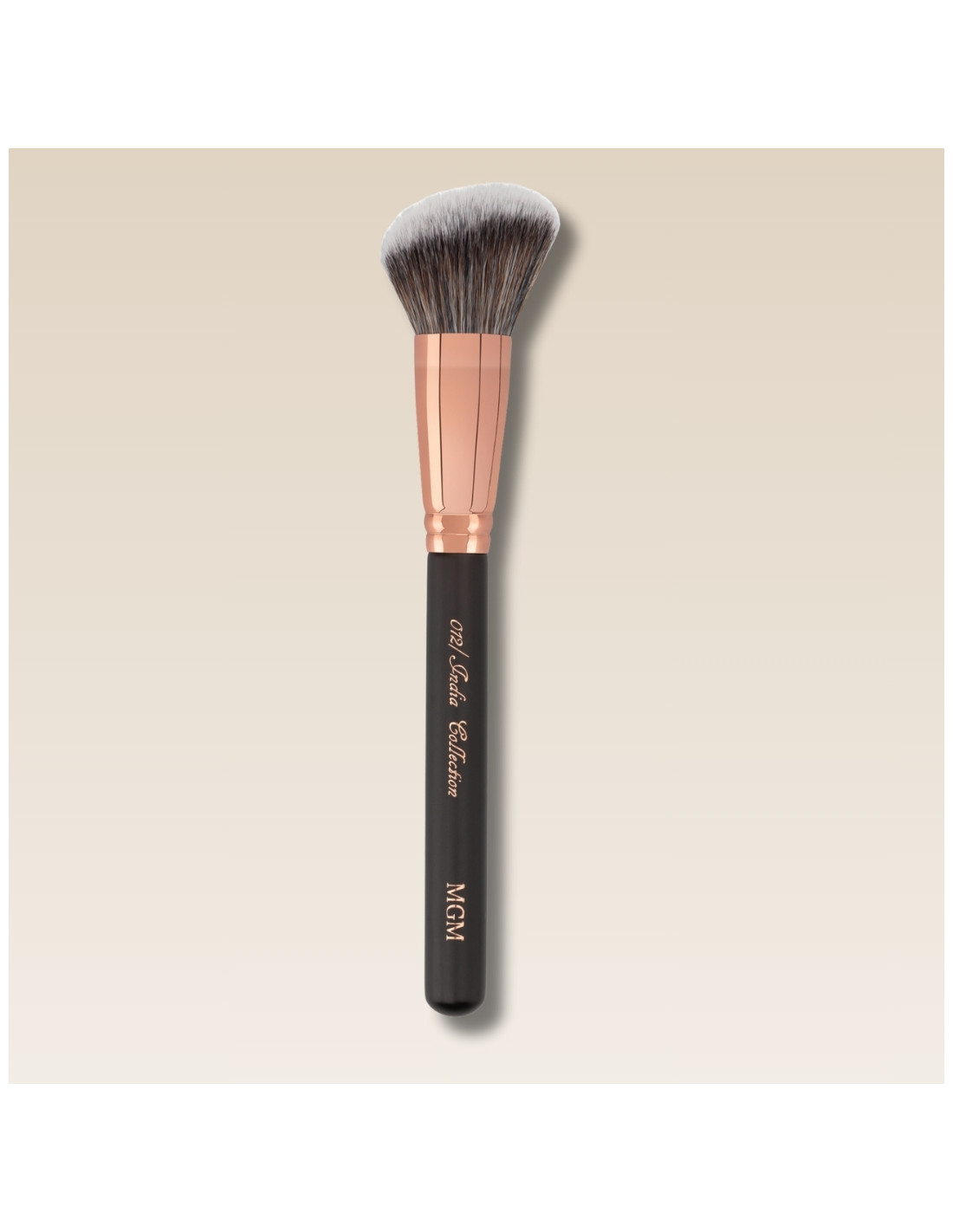 Pincel sesgado bicolor de fibra sintética ideal para trabajar la piel y extender el producto de forma amplia, ideal para hacer contorneados suaves tanto para producto en polvo como graso.